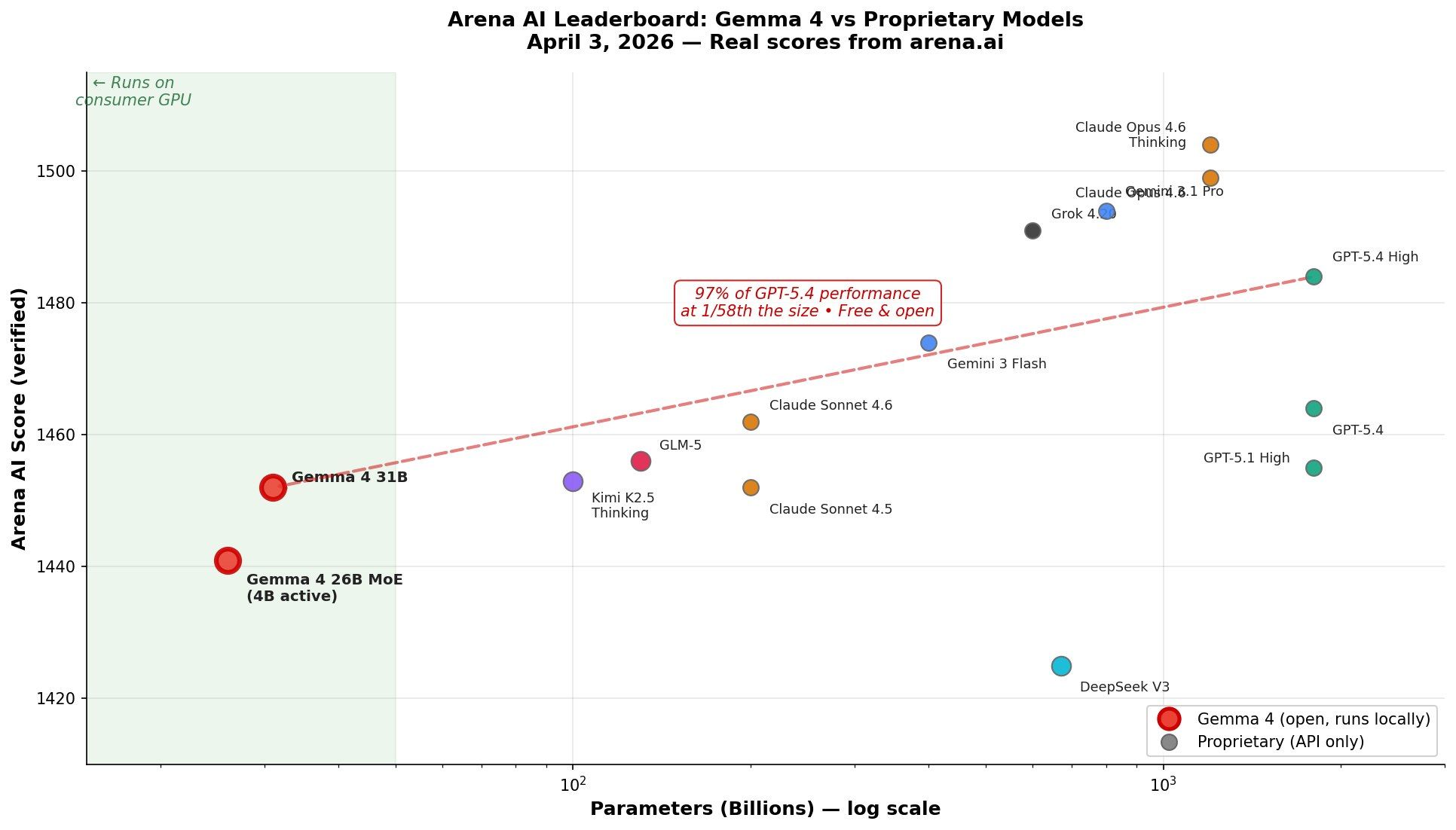 I’ll emphasize that the x-axis is on a log scale. Gemma 4 is absolutely tiny, yet ranks as the 3rd best open model on ArenaML, the popular chatbot arena.